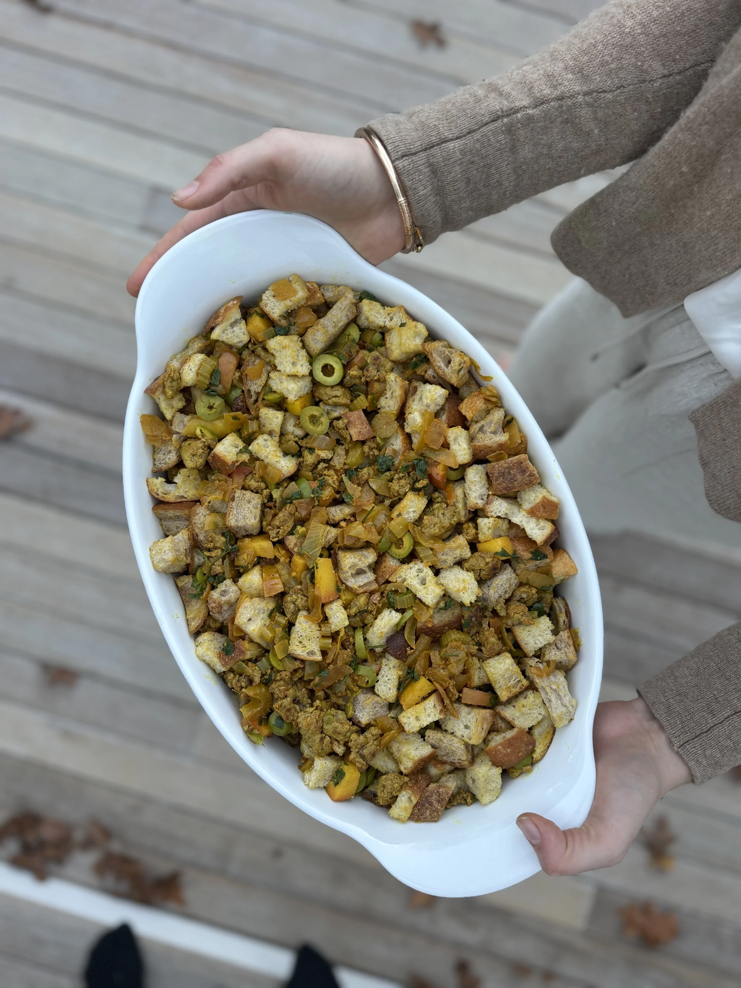 To make this in advance, prepare the bread-cube croutons a day ahead and let them sit out uncovered, and sauté your stuffing filling in the morning so it can cool on the counter until you’re ready to assemble later. Since my holiday kitchen is typically bustling, I almost always take this approach to the stuffing. Serve warm, with love, and plan for seconds.